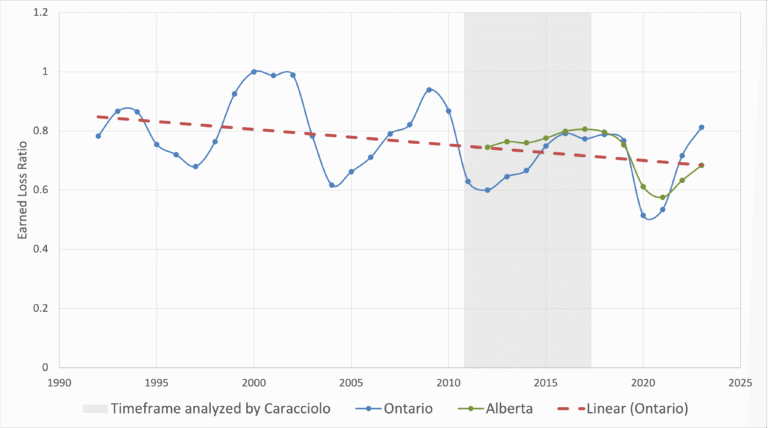 In addition to providing some additional background, we provide evidence for an alternative to what The Price of Over-Regulation concludes. Below, we offer some context and an alternative story to why provinces in group 1, the “more regulated” provinces, saw premiums increase less in line with claim costs from 2011 to 2016. Specifically in 2010, the government of Ontario changed the regulations as to the amount firms had to pay out for bodily injury accidents. By 2011 the total claims paid out by Ontario’s auto insurers and other costs associated with those claims dropped 24%. Figure 2 graphs the earned loss ratio from 1992 to 2023 in Ontario and 2012 to 2023 in Alberta. The earned loss ratio is the sum of the total claims and the costs associated with those claims (think lawyer fees) divided by the total value of premiums collected (or earned) in a year. An earned loss of one in 2000 would indicate that for every dollar collected in premiums the firms spent one dollar on claims or claim related expenses, while a ratio of 0.6 in 2004 would indicate that only 60 cents of every dollar collected in premiums were spent on claims or claim related expenses. As claim and claim related costs account for the vast majority of a firm’s overall business costs we can think of the earned loss as a measure of profitability