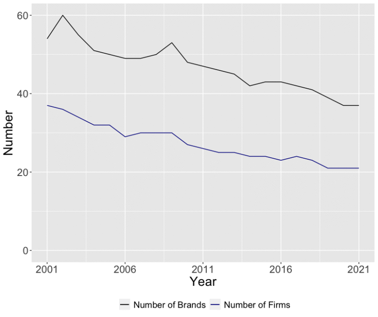 An assumption made by The Price of Over-Regulation is that competition in the Canadian auto insurance industry remains competitive. If the industry was to become too concentrated a more flexible premium rate adjustment policy could be abused. The C.D. Howe paper rightly points out this risk. However, competition in auto insurance has quietly been going away for decades, with more mergers on the horizon. Figure 1 shows the number of brands and firms operating in Ontario each year from 2001 to 2021. Here brands refer to the name brands you see when shopping for insurance such as Intact, Belair Direct, Trafalgar, Novex, or others. However, many firms like Intact own multiple brands, so while you may see 55 options in 2001 just know they are owned by just 38 firms. All the ones we just mentioned are owned by Intact. As Figure 1 shows, both the number of brands and the number of firms are falling. From 2001 to 2021 the number of firms operating in Ontario fell by 45%. The decrease in the number of firms have been driven by merger and acquisitions by Canada’s largest insurers. An example of which is that in 2020, Intact bought Royal Sun Alliance and the merger was completed in 2021. The Intact RSA merger at the auto insurance level represents one of largest increases of concentration in the industry in decades. Then looking ahead, just this March Definity (formerly Economical) announced the purchase of Travelers, which would see the 6th and 12th merge to become the 4th largest property insurers in Canada. Definity has publicly stated their plans to grow through future mergers. With consolidation front of mind for Canada’s auto insurance industry we cannot forget that the level of competition and the needed level of oversight are linked.